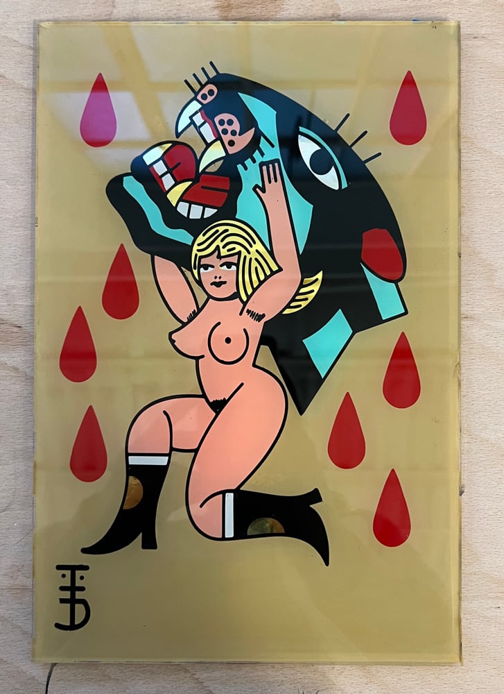 Hand painted one shot paint , white gold leaf and mother pearl on glass